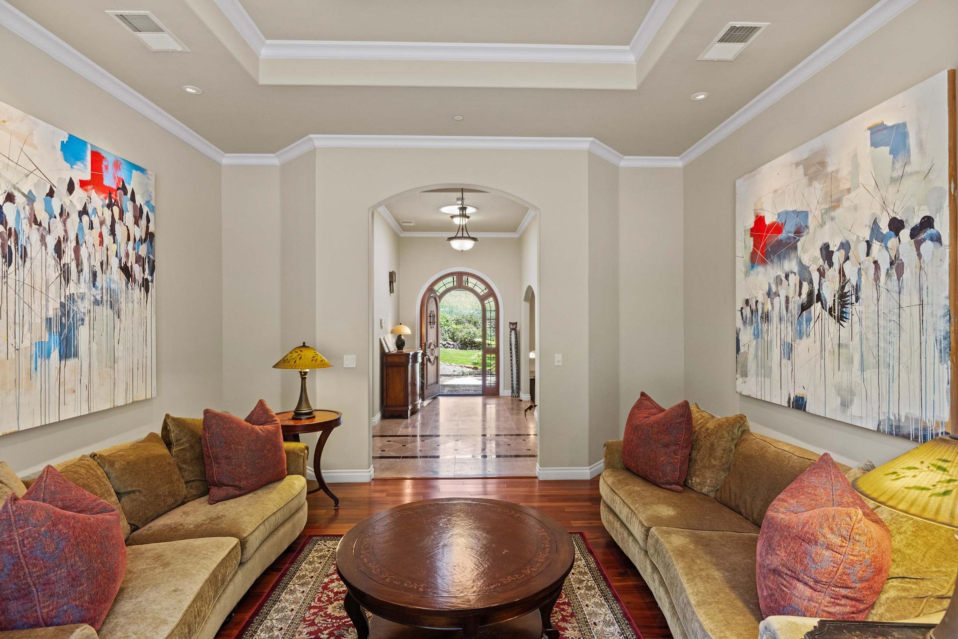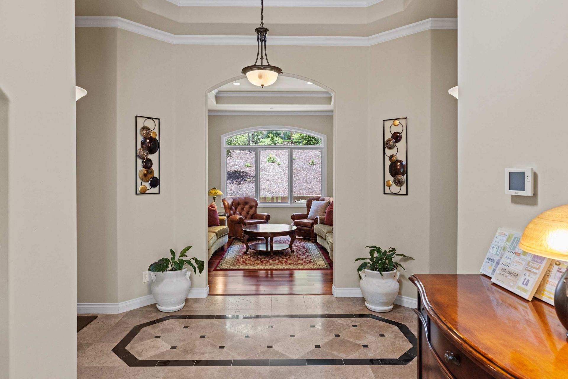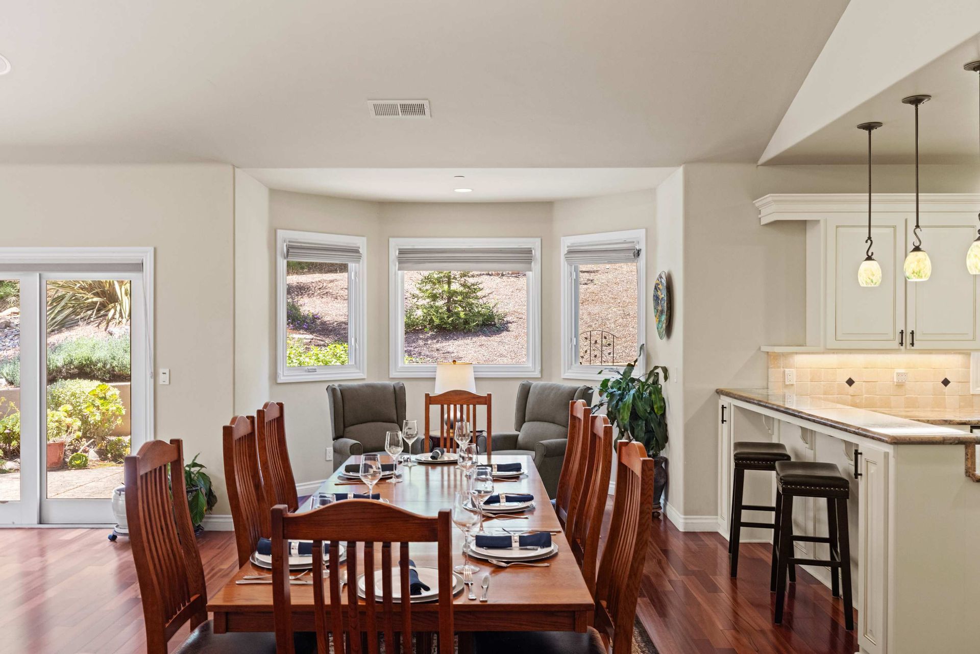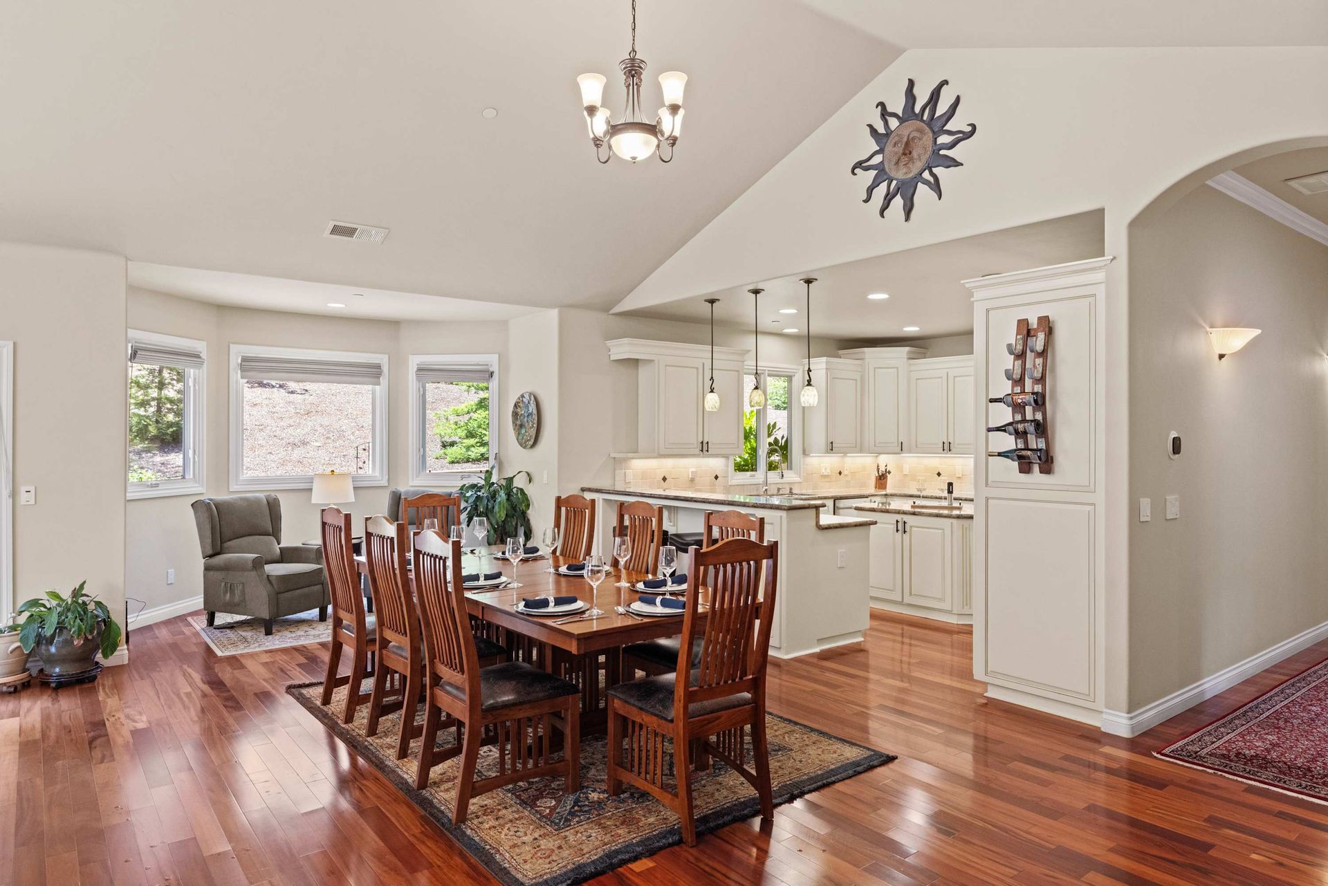Villa Bonita offers both formal and casual spaces to relax and entertain, with separate living and family rooms, elegant dining areas, and a chef’s kitchen at the heart of it all. Recently updated appliances, a generous center island, double ovens, a wine fridge, and a breakfast bar make it a dream for home cooks and hosts alike. From the kitchen, enjoy a clear view of the warm, wood dining table that comfortably seats eight.