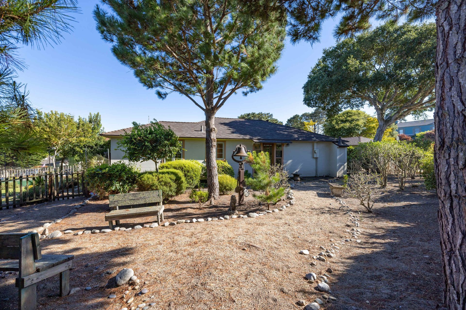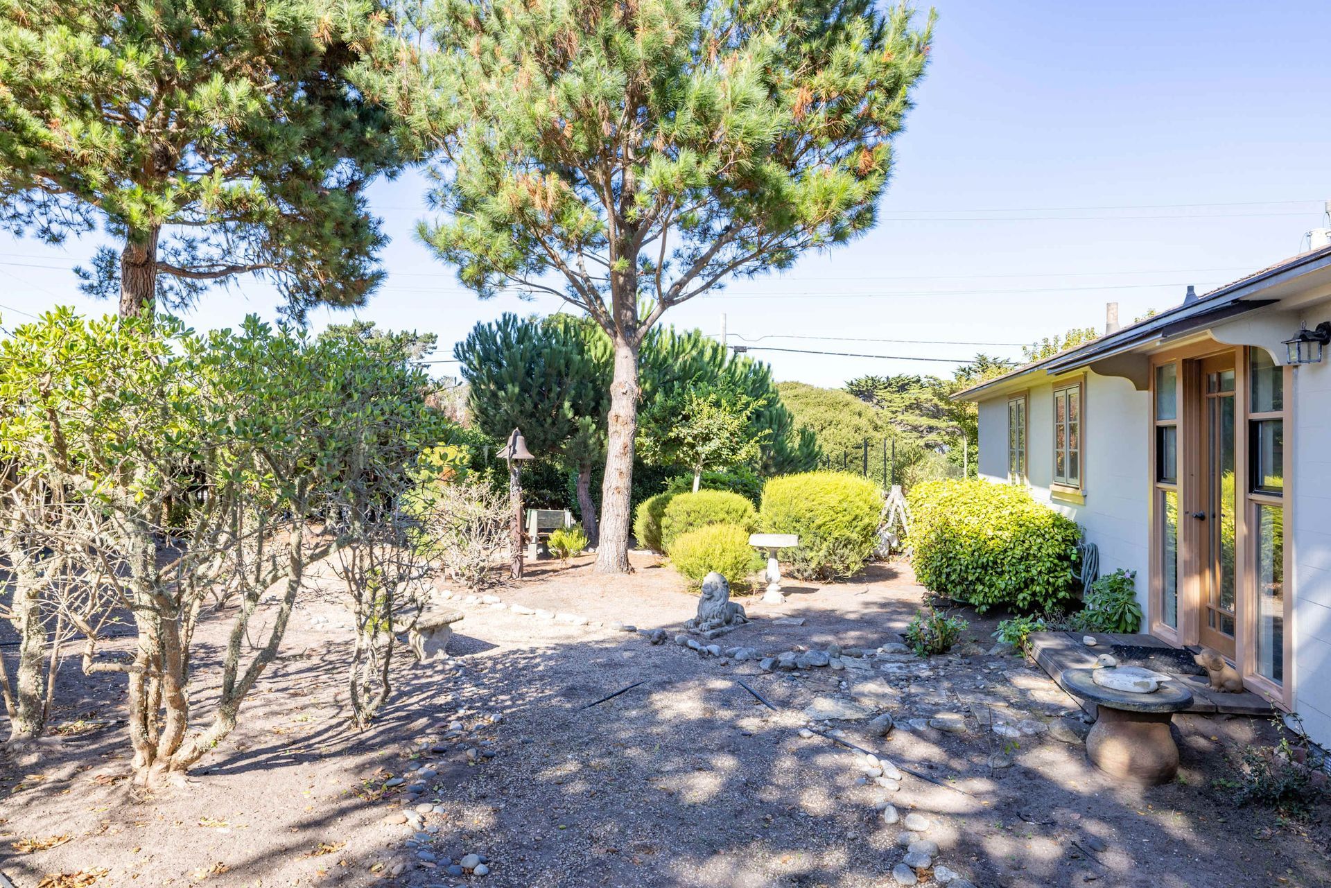 Step outside to discover a thoughtfully preserved backyard garden—complete with stone pathways, original benches, and sculptural touches tucked among the pines and coastal shrubs. It’s quiet, sun-dappled, and made for morning coffee or evening glass of wine. The surrounding greenery offers a rare sense of privacy in a beachside setting.